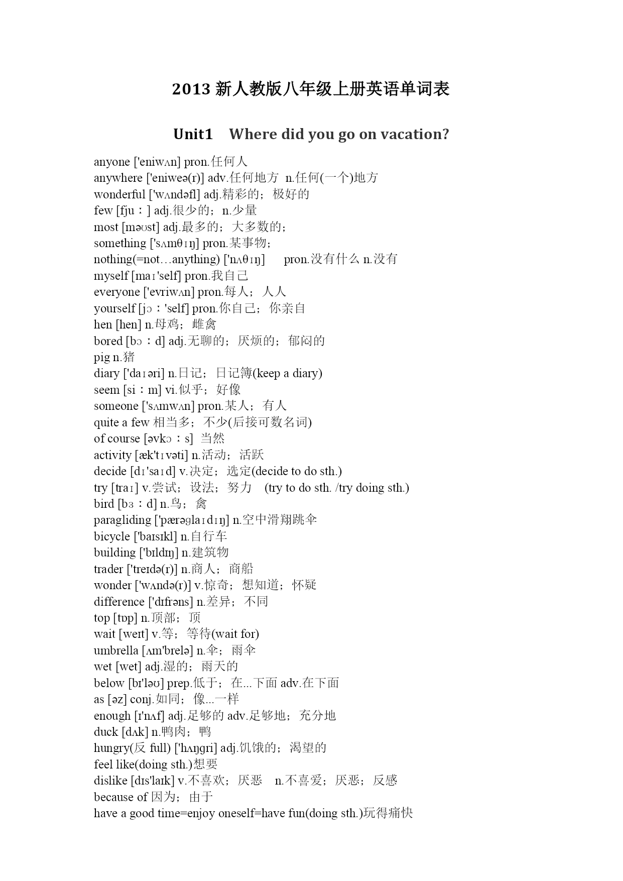 2013新人教版八年级上册英语单词表Unit1Wheredidyougoonvacation?anyone['eniwʌn]pron.任何人anywhere['eniweə(r)]adv.任何地方n.任何(一个)地方wonderful['wʌndəfl]adj.精彩的;极好的few[fjuː]adj.很少的;n.少量most[məʊst]adj.最多的;大多数的;something['sʌmθɪŋ]pron.某事物;nothing(=not…anything)['nʌθɪŋ]pron.没有什么n.没有my