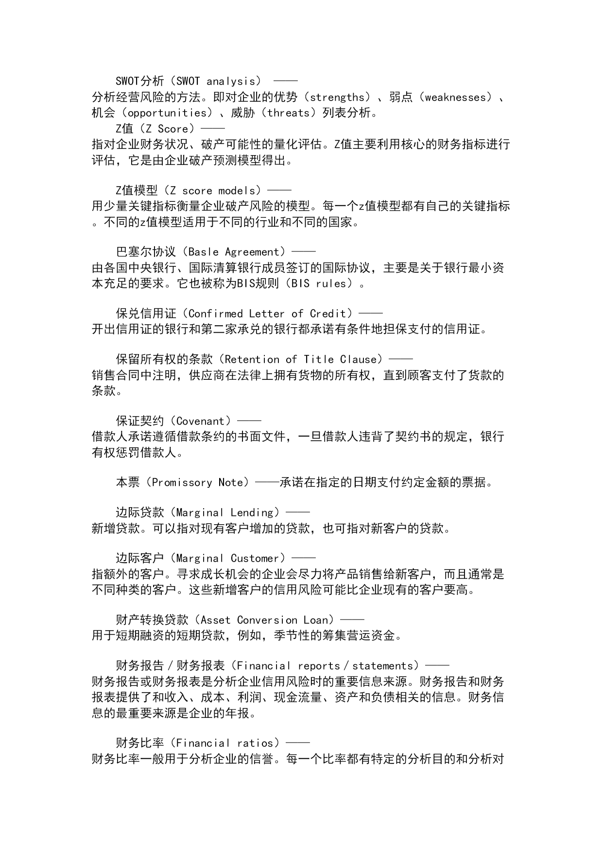 SWOT分析(SWOTanalysis)——分析经营风险的方法。即对企业的优势(strengths)、弱点(weaknesses)、机会(opportunities)、威胁(threats)列表分析。Z值(ZScore)——指对企业财务状况、破产可能性的量化评估。Z值主要利用核心的财务指标进行评估,它是由企业破产预测模型得出。Z值模型(Zscoremodels)——用少量关键指标衡量企业破产风险的模型。每一个z值模型都有自己的关键指标。不同的z值模型适用于不同的行业和不同的国家。巴塞尔协议(BasleAg