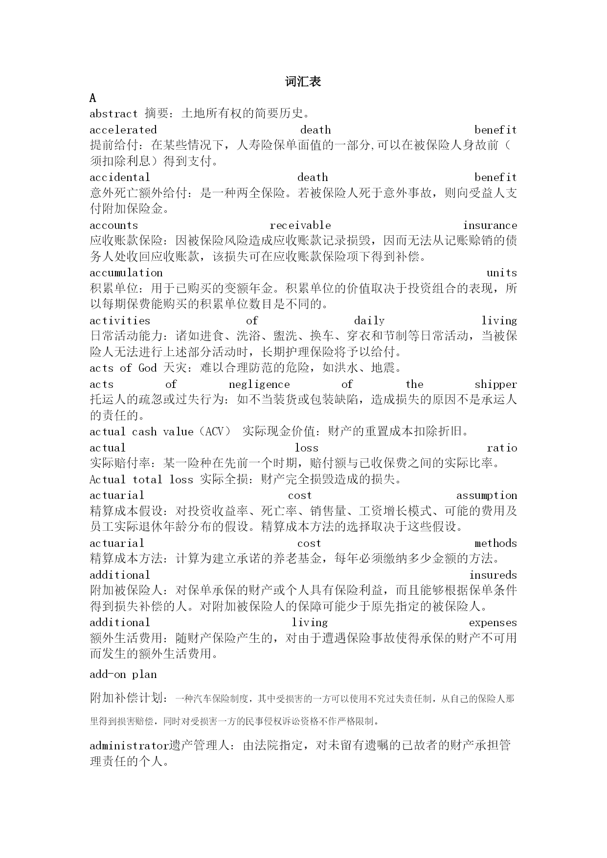 词汇表Aabstract摘要:土地所有权的简要历史。accelerateddeathbenefit提前给付:在某些情况下,人寿险保单面值的一部分,可以在被保险人身故前(须扣除利息)得到支付。accidentaldeathbenefit意外死亡额外给付:是一种两全保险。若被保险人死于意外事故,则向受益人支付附加保险金。accountsreceivableinsurance应收账款保险:因被保险风险造成应收账款记录损毁,因而无法从记账赊销的债务人处收回应收账款,该损失可在应收账款保险项下得到补偿。accumu