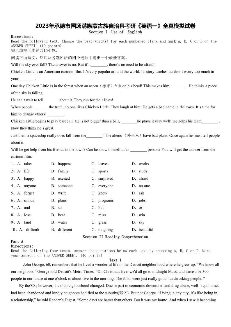 2023年承德市围场满族蒙古族自治县考研《英语一》全真模拟试卷SectionIUseofEnglishDirections:Readthefollowingtext.Choosethebestword(s)foreachnumberedblankandmarkA,B,CorDontheANSWERSHEET.(10points)完形填空(本题共10小题,阅读下面短文,然后从各题所给的四个选项中选出一个最佳答案。Willtheskyeverfall?Theanswerisno.Butifit________