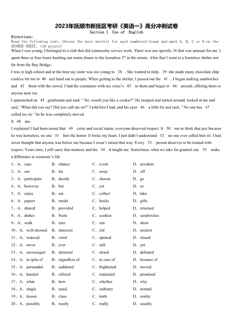 2023年抚顺市新抚区考研《英语一》高分冲刺试卷SectionIUseofEnglishDirections:Readthefollowingtext.Choosethebestword(s)foreachnumberedblankandmarkA,B,CorDontheANSWERSHEET.(10points)WhenIwasyoung,Ibelongedtoaclubthatdidcommunityservicework.Therewasonespecific36thatwasunusualform