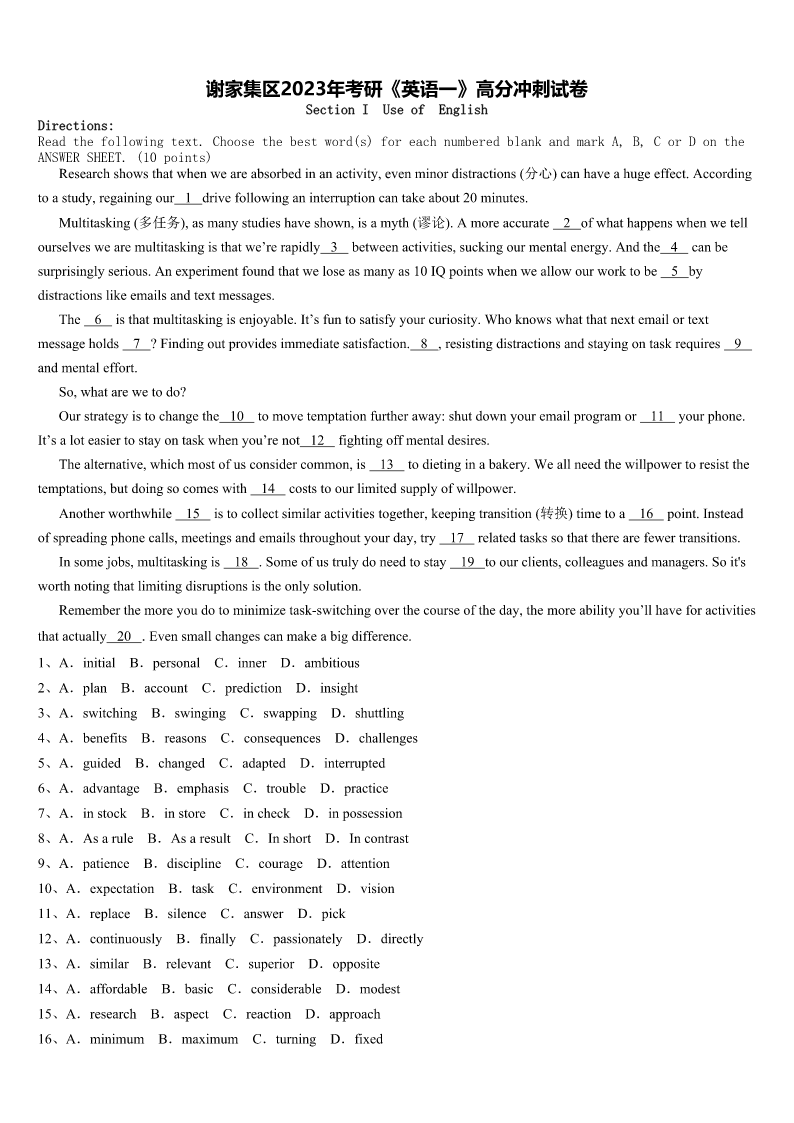 谢家集区2023年考研《英语一》高分冲刺试卷SectionIUseofEnglishDirections:Readthefollowingtext.Choosethebestword(s)foreachnumberedblankandmarkA,B,CorDontheANSWERSHEET.(10points)Researchshowsthatwhenweareabsorbedinanactivity,evenminordistractions(分心)canhaveahugeeffect.Accordin