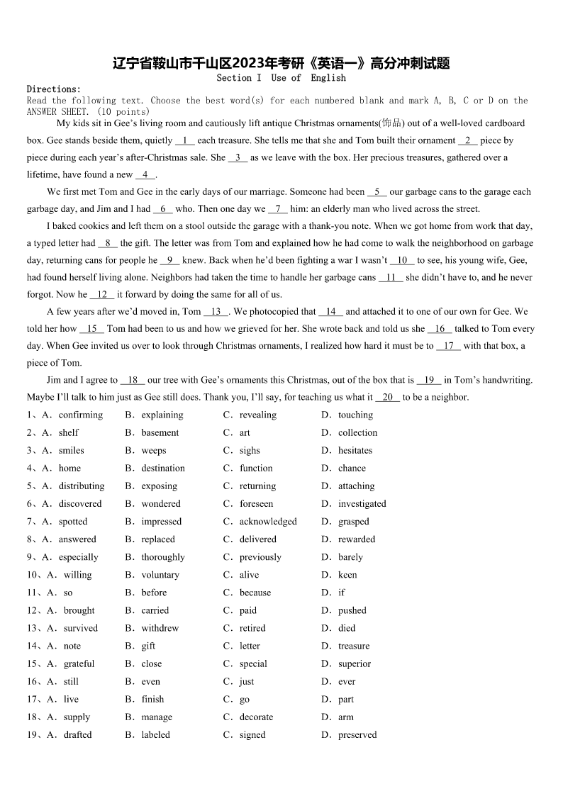 辽宁省鞍山市千山区2023年考研《英语一》高分冲刺试题SectionIUseofEnglishDirections:Readthefollowingtext.Choosethebestword(s)foreachnumberedblankandmarkA,B,CorDontheANSWERSHEET.(10points)MykidssitinGee’slivingroomandcautiouslyliftantiqueChristmasornaments(饰品)outofawell-lovedcardbo