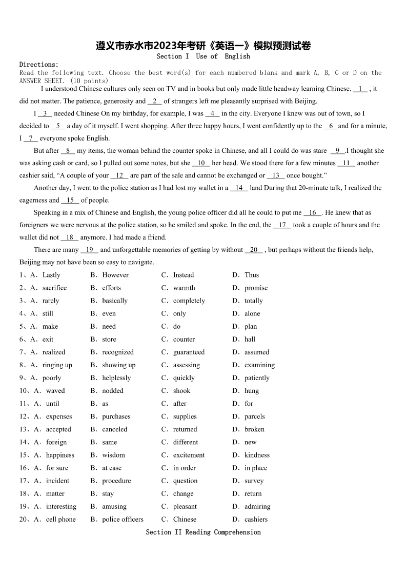 遵义市赤水市2023年考研《英语一》模拟预测试卷SectionIUseofEnglishDirections:Readthefollowingtext.Choosethebestword(s)foreachnumberedblankandmarkA,B,CorDontheANSWERSHEET.(10points)IunderstoodChineseculturesonlyseenonTVandinbooksbutonlymadelittleheadwaylearningChinese.1,itdidno