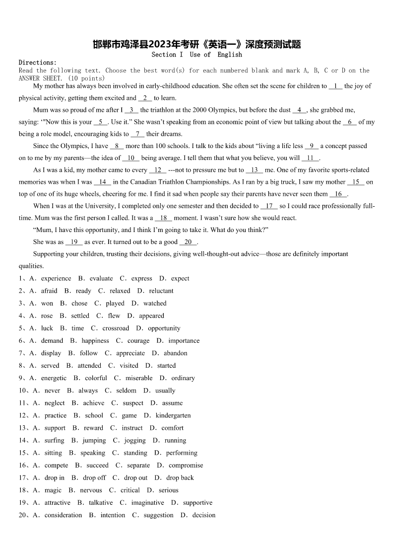 邯郸市鸡泽县2023年考研《英语一》深度预测试题SectionIUseofEnglishDirections:Readthefollowingtext.Choosethebestword(s)foreachnumberedblankandmarkA,B,CorDontheANSWERSHEET.(10points)Mymotherhasalwaysbeeninvolvedinearly-childhoodeducation.Sheoftensetthesceneforchildrento1thejoyof
