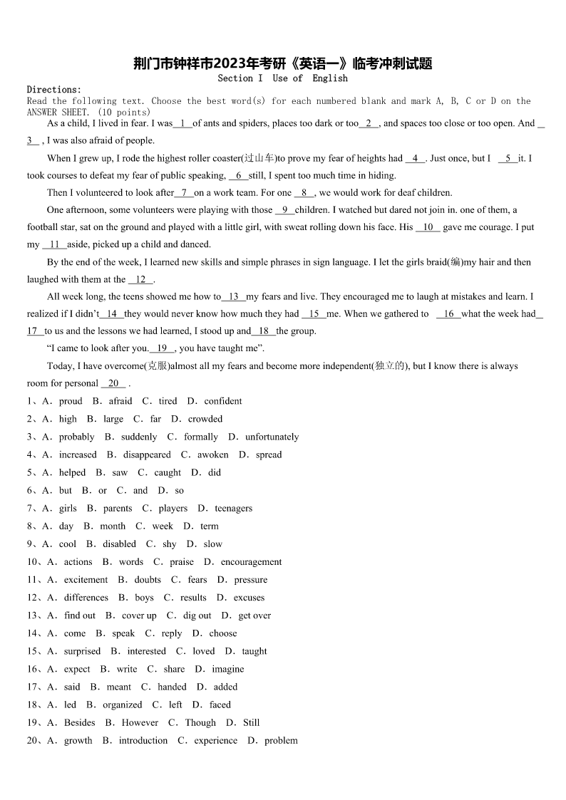 荆门市钟祥市2023年考研《英语一》临考冲刺试题SectionIUseofEnglishDirections:Readthefollowingtext.Choosethebestword(s)foreachnumberedblankandmarkA,B,CorDontheANSWERSHEET.(10points)Asachild,Ilivedinfear.Iwas1ofantsandspiders,placestoodarkortoo2,andspacestoocloseortooopen.And3,I