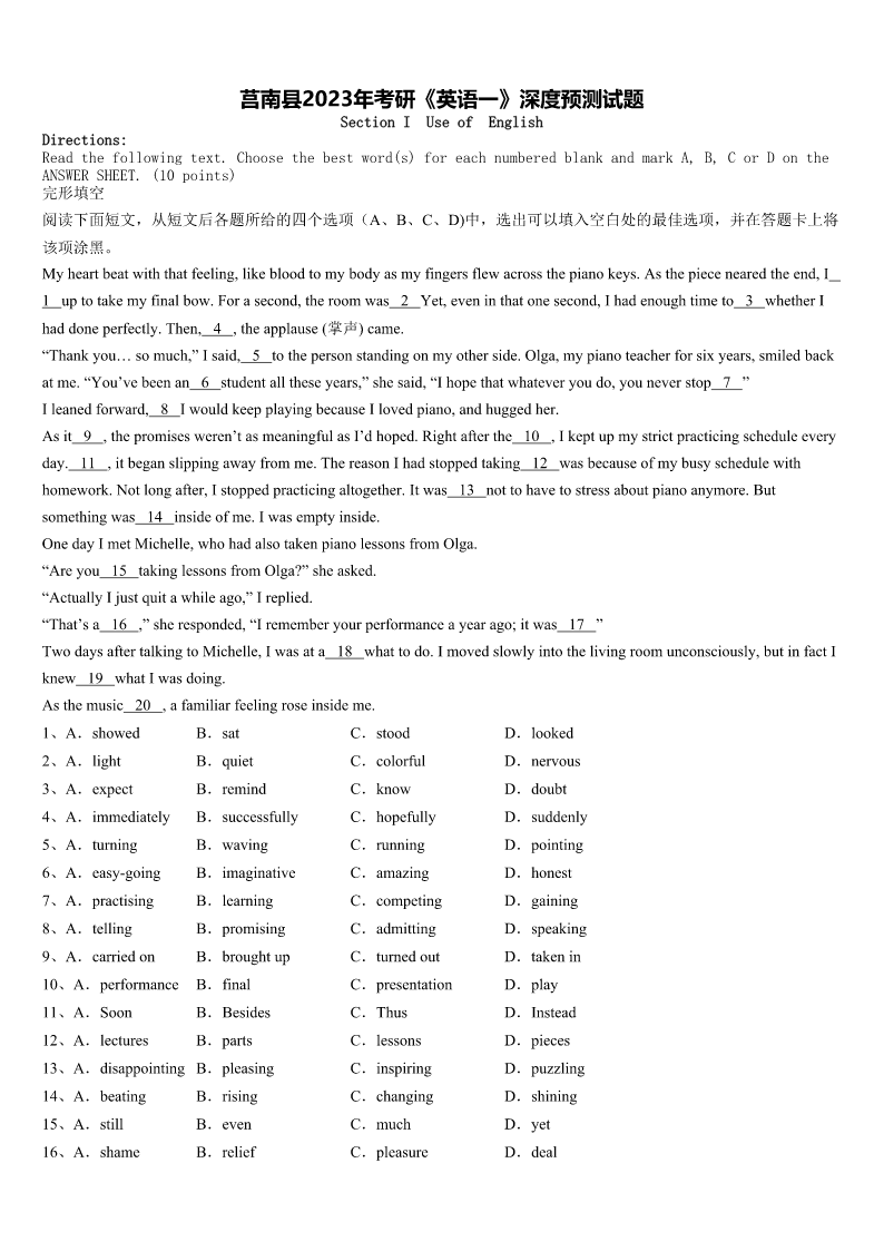 莒南县2023年考研《英语一》深度预测试题SectionIUseofEnglishDirections:Readthefollowingtext.Choosethebestword(s)foreachnumberedblankandmarkA,B,CorDontheANSWERSHEET.(10points)完形填空阅读下面短文,从短文后各题所给的四个选项(A、B、C、D)中,选出可以填入空白处的最佳选项,并在答题卡上将该项涂黑。Myheartbeatwiththatfeeling,likebloodto