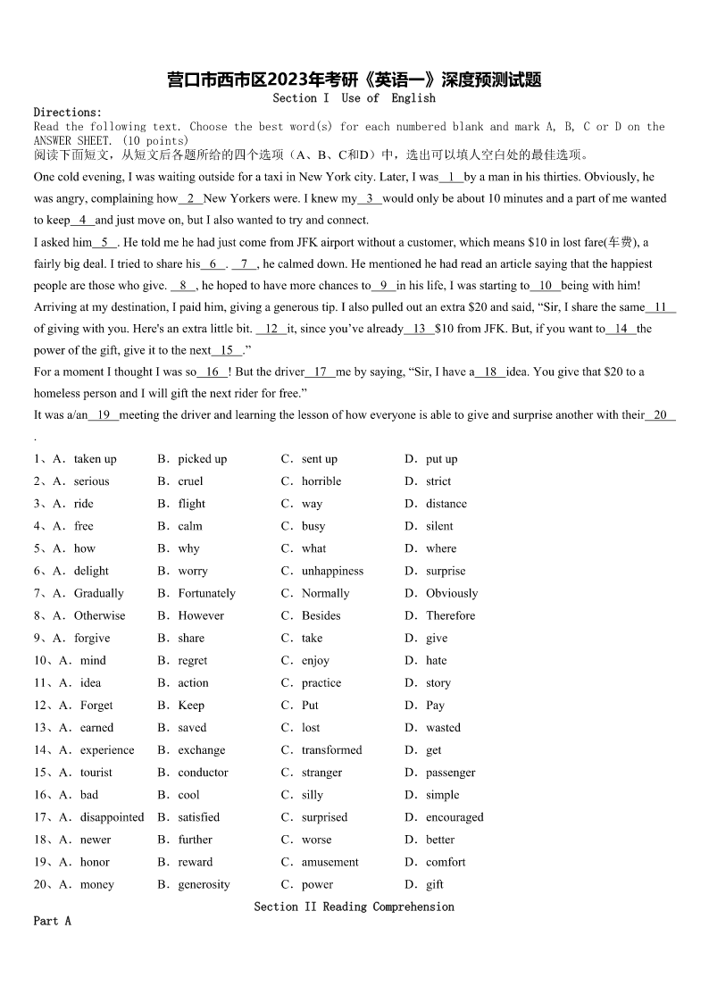 营口市西市区2023年考研《英语一》深度预测试题SectionIUseofEnglishDirections:Readthefollowingtext.Choosethebestword(s)foreachnumberedblankandmarkA,B,CorDontheANSWERSHEET.(10points)阅读下面短文,从短文后各题所给的四个选项(A、B、C和D)中,选出可以填人空白处的最佳选项。Onecoldevening,IwaswaitingoutsideforataxiinNewYorkc