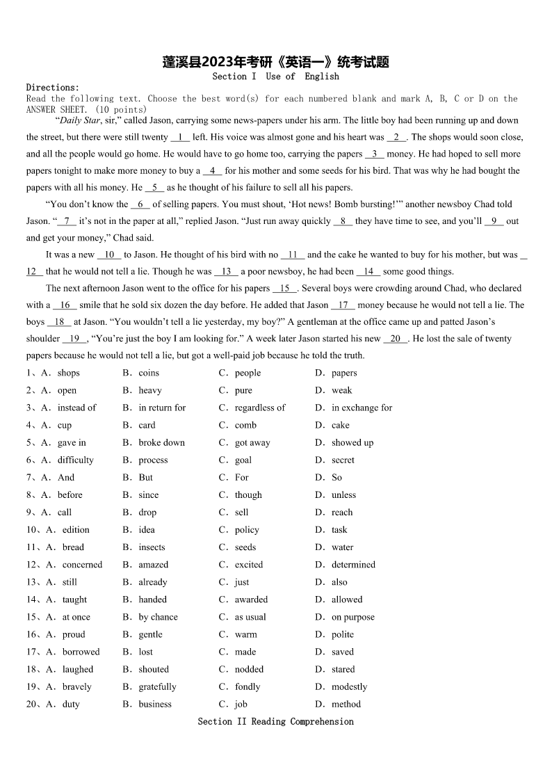 蓬溪县2023年考研《英语一》统考试题SectionIUseofEnglishDirections:Readthefollowingtext.Choosethebestword(s)foreachnumberedblankandmarkA,B,CorDontheANSWERSHEET.(10points)“DailyStar,sir,”calledJason,carryingsomenews-papersunderhisarm.Thelittleboyhadbeenrunningupanddownthes