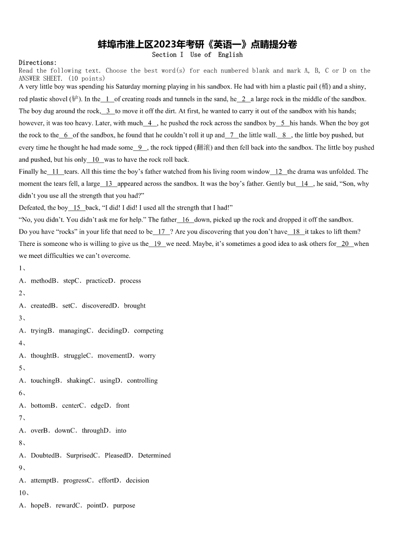 蚌埠市淮上区2023年考研《英语一》点睛提分卷SectionIUseofEnglishDirections:Readthefollowingtext.Choosethebestword(s)foreachnumberedblankandmarkA,B,CorDontheANSWERSHEET.(10points)AverylittleboywasspendinghisSaturdaymorningplayinginhissandbox.Hehadwithhimaplasticpail(桶)andashin