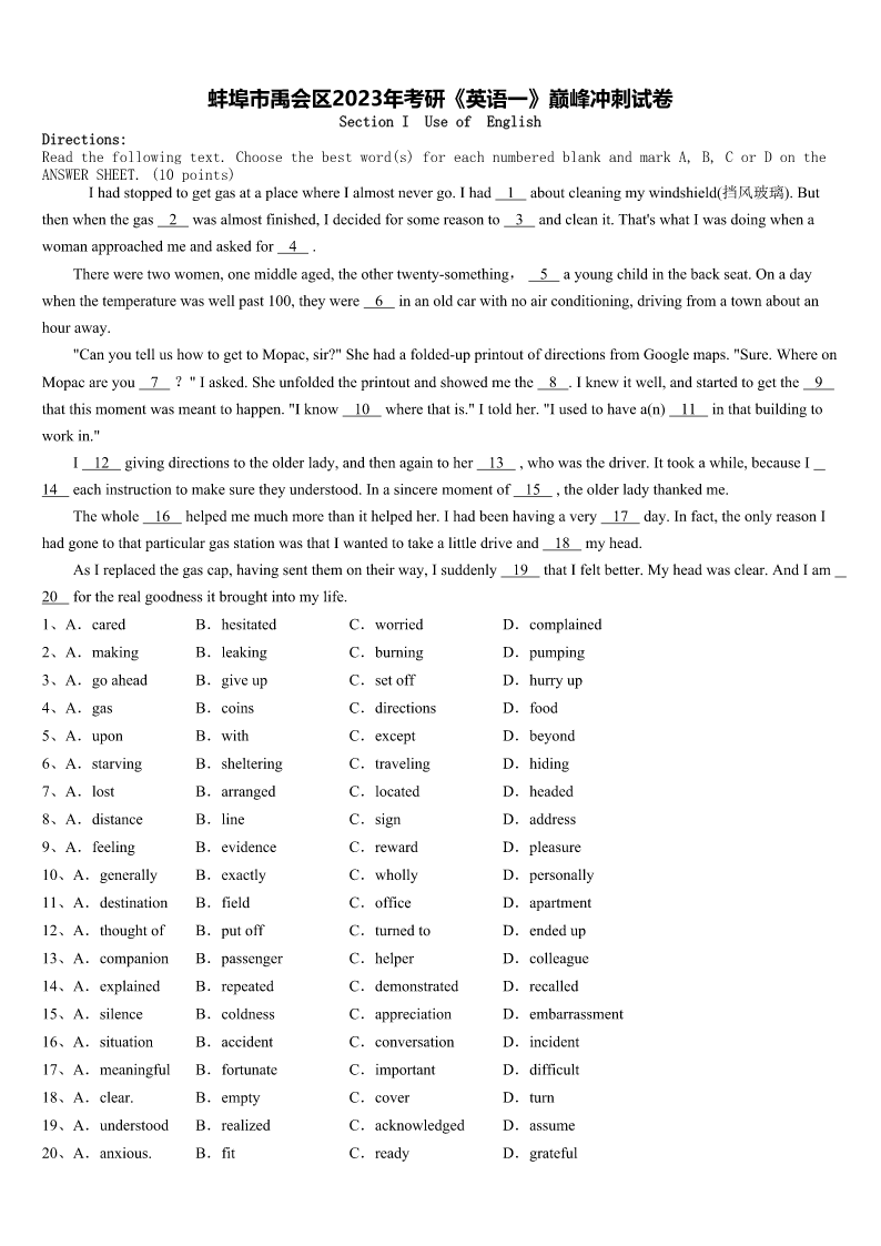 蚌埠市禹会区2023年考研《英语一》巅峰冲刺试卷SectionIUseofEnglishDirections:Readthefollowingtext.Choosethebestword(s)foreachnumberedblankandmarkA,B,CorDontheANSWERSHEET.(10points)IhadstoppedtogetgasataplacewhereIalmostnevergo.Ihad1aboutcleaningmywindshield(挡风玻璃).Butthenwhenth