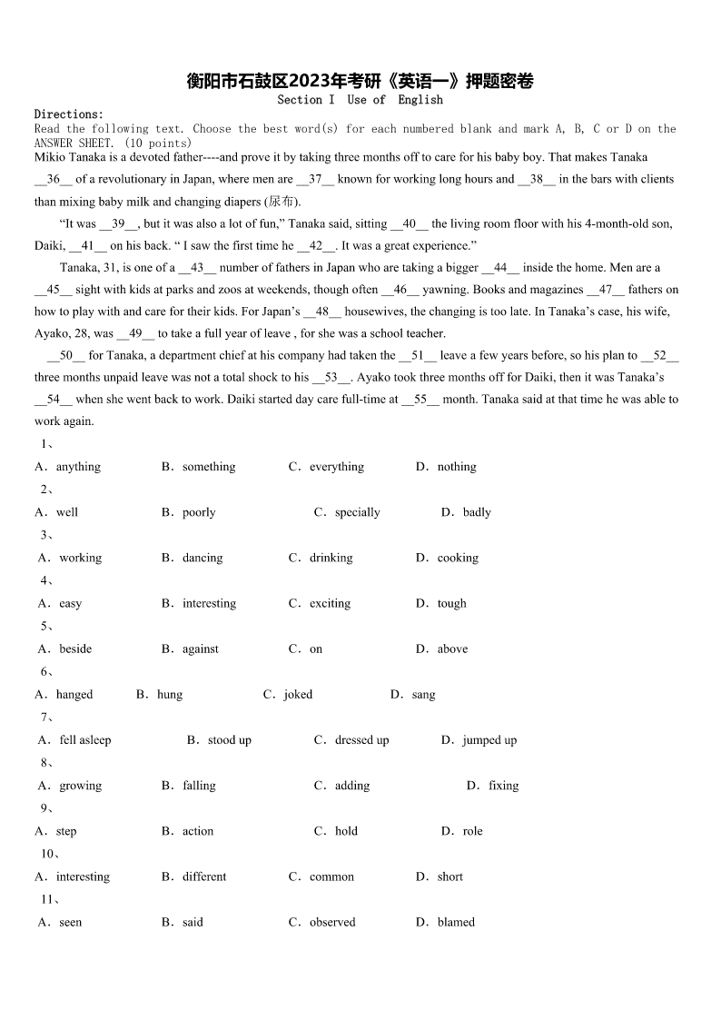 衡阳市石鼓区2023年考研《英语一》押题密卷SectionIUseofEnglishDirections:Readthefollowingtext.Choosethebestword(s)foreachnumberedblankandmarkA,B,CorDontheANSWERSHEET.(10points)MikioTanakaisadevotedfather----andproveitbytakingthreemonthsofftocareforhisbabyboy.ThatmakesTanaka_