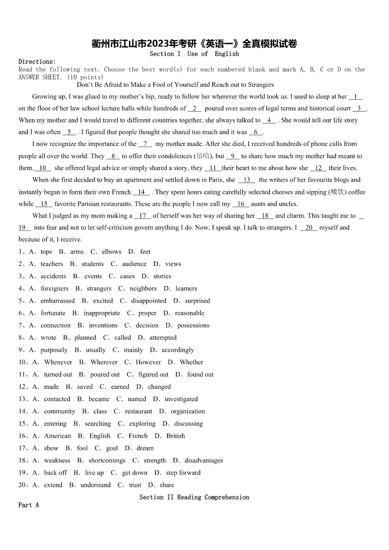 衢州市江山市2023年考研《英语一》全真模拟试卷SectionIUseofEnglishDirections:Readthefollowingtext.Choosethebestword(s)foreachnumberedblankandmarkA,B,CorDontheANSWERSHEET.(10points)Don’tBeAfraidtoMakeaFoolofYourselfandReachouttoStrangersGrowingup,Iwasgluedtomymother’ship,readyt