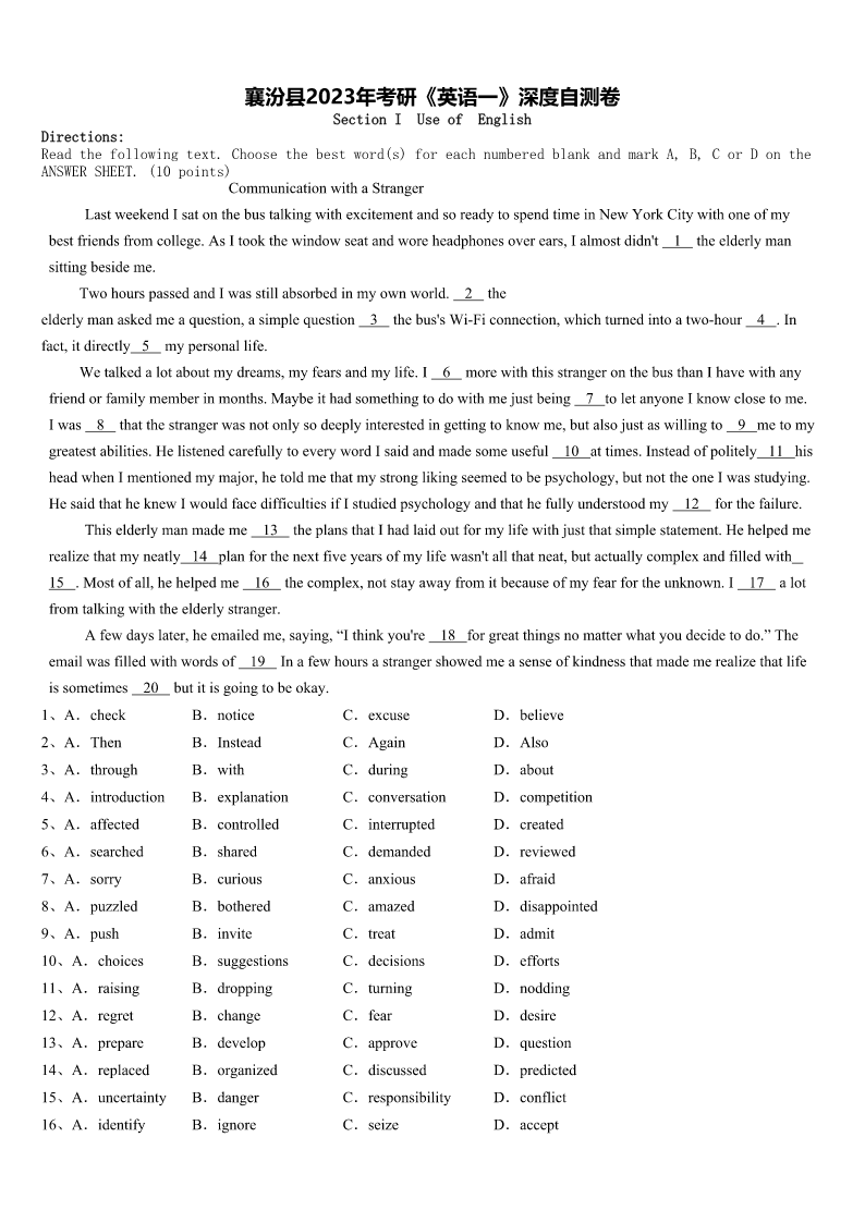 襄汾县2023年考研《英语一》深度自测卷SectionIUseofEnglishDirections:Readthefollowingtext.Choosethebestword(s)foreachnumberedblankandmarkA,B,CorDontheANSWERSHEET.(10points)CommunicationwithaStrangerLastweekendIsatonthebustalkingwithexcitementandsoreadytospendtimeinNewYorkC