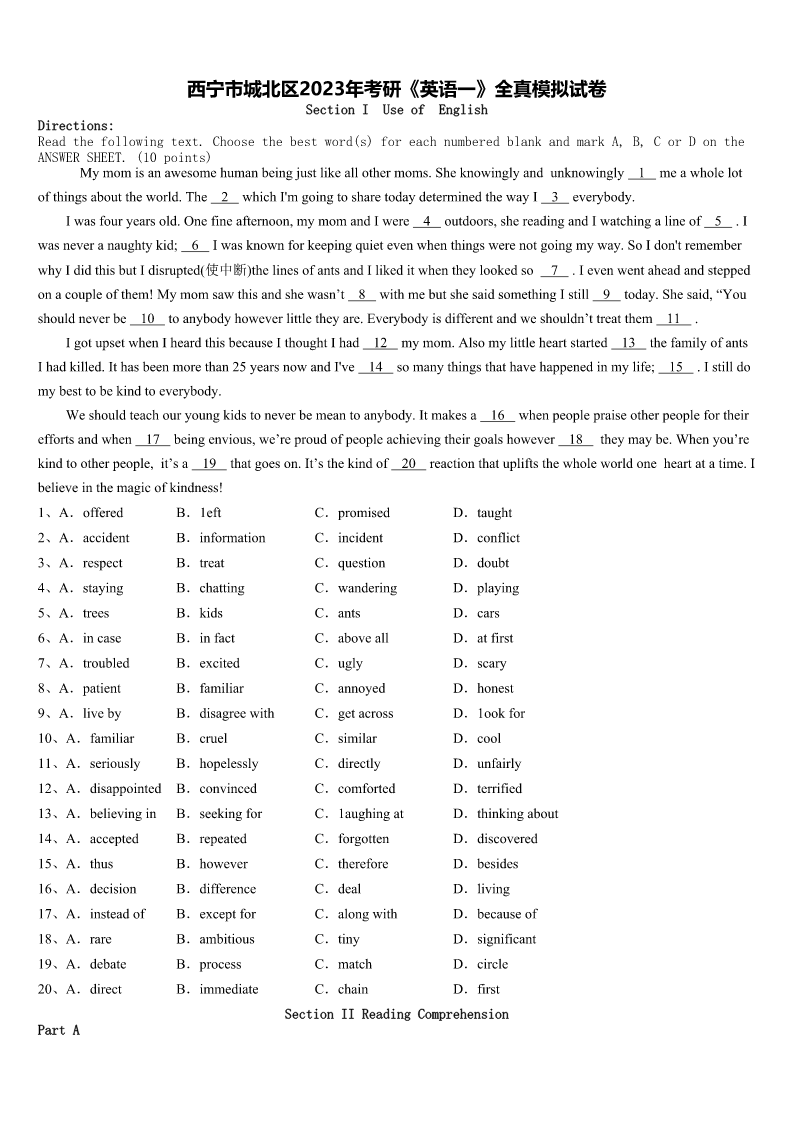 西宁市城北区2023年考研《英语一》全真模拟试卷SectionIUseofEnglishDirections:Readthefollowingtext.Choosethebestword(s)foreachnumberedblankandmarkA,B,CorDontheANSWERSHEET.(10points)Mymomisanawesomehumanbeingjustlikeallothermoms.Sheknowinglyandunknowingly1meawholelotofthingsabou