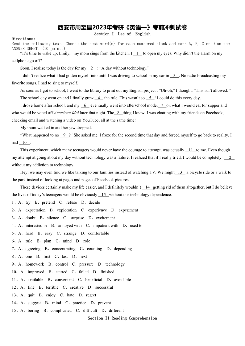西安市周至县2023年考研《英语一》考前冲刺试卷SectionIUseofEnglishDirections:Readthefollowingtext.Choosethebestword(s)foreachnumberedblankandmarkA,B,CorDontheANSWERSHEET.(10points)“It’stimetowakeup,Emily,”mymomsingsfromthekitchen.I1toopenmyeyes.Whydidn’tthealarmonmycellphonego