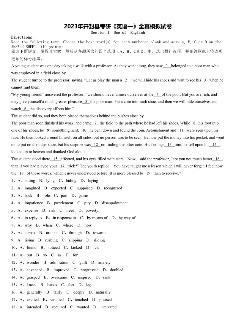 2023年开封县考研《英语一》全真模拟试卷SectionIUseofEnglishDirections:Readthefollowingtext.Choosethebestword(s)foreachnumberedblankandmarkA,B,CorDontheANSWERSHEET.(10points)阅读下面短文,掌握其大意,然后从各题所给的四个选项(A、B、C和D)中,选出最佳选项,并在答题纸上将该项选项的标号涂黑。Ayoungstudentwasonedaytakingawalkwithapr