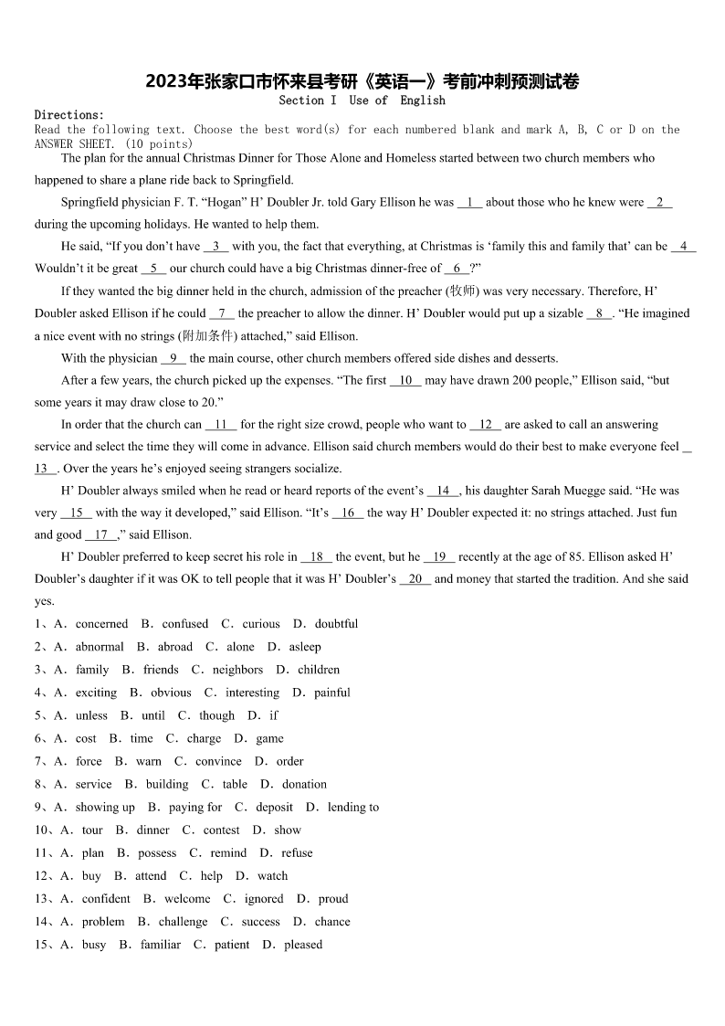 2023年张家口市怀来县考研《英语一》考前冲刺预测试卷SectionIUseofEnglishDirections:Readthefollowingtext.Choosethebestword(s)foreachnumberedblankandmarkA,B,CorDontheANSWERSHEET.(10points)TheplanfortheannualChristmasDinnerforThoseAloneandHomelessstartedbetweentwochurchmemberswhohap