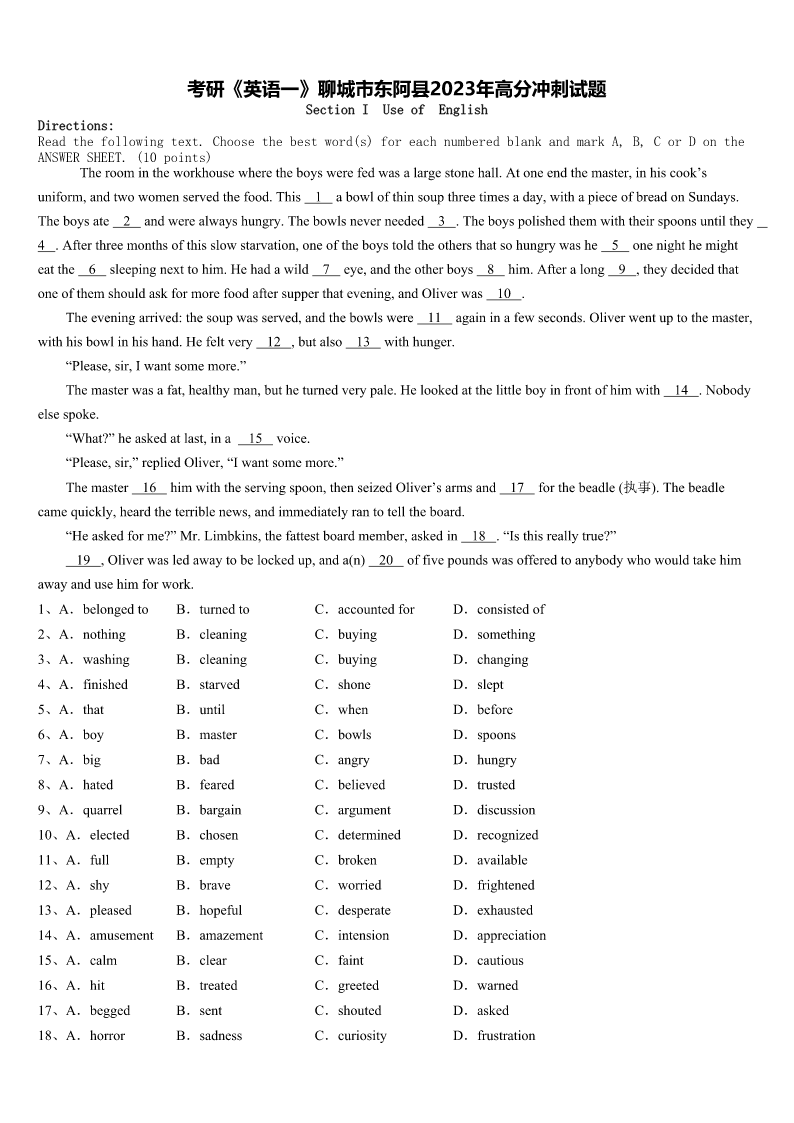 考研《英语一》聊城市东阿县2023年高分冲刺试题SectionIUseofEnglishDirections:Readthefollowingtext.Choosethebestword(s)foreachnumberedblankandmarkA,B,CorDontheANSWERSHEET.(10points)Theroomintheworkhousewheretheboyswerefedwasalargestonehall.Atoneendthemaster,inhiscook’suniform,a