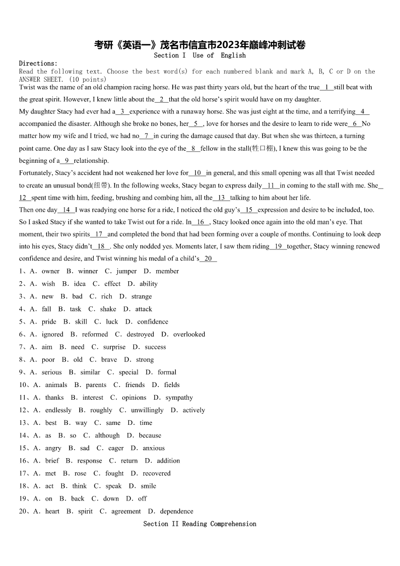 考研《英语一》茂名市信宜市2023年巅峰冲刺试卷SectionIUseofEnglishDirections:Readthefollowingtext.Choosethebestword(s)foreachnumberedblankandmarkA,B,CorDontheANSWERSHEET.(10points)Twistwasthenameofanoldchampionracinghorse.Hewaspastthirtyyearsold,buttheheartofthetrue1stillbeatw