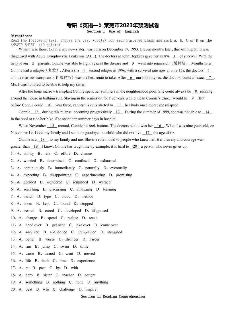 考研《英语一》莱芜市2023年预测试卷SectionIUseofEnglishDirections:Readthefollowingtext.Choosethebestword(s)foreachnumberedblankandmarkA,B,CorDontheANSWERSHEET.(10points)WhenIwasthree,Connie,mynewsister,wasbornonDecember17,1993.Elevenmonthslater,thissmilingchildwasdiagnos