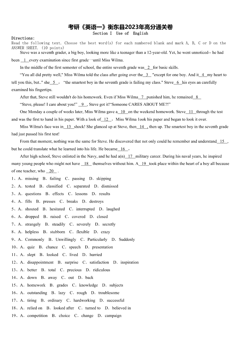 考研《英语一》蒙城县2023年临考冲刺试题SectionIUseofEnglishDirections:Readthefollowingtext.Choosethebestword(s)foreachnumberedblankandmarkA,B,CorDontheANSWERSHEET.(10points)Asamusicteacher,Ihavealwaysknownthatmusictouchesthesoul.Itcan1allkindsofbarrierstoreachstudentsinave