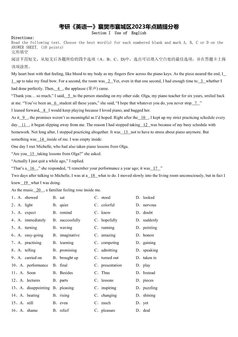 考研《英语一》襄樊市襄城区2023年点睛提分卷SectionIUseofEnglishDirections:Readthefollowingtext.Choosethebestword(s)foreachnumberedblankandmarkA,B,CorDontheANSWERSHEET.(10points)完形填空阅读下面短文,从短文后各题所给的四个选项(A、B、C、D)中,选出可以填入空白处的最佳选项,并在答题卡上将该项涂黑。Myheartbeatwiththatfeeling,likeblood