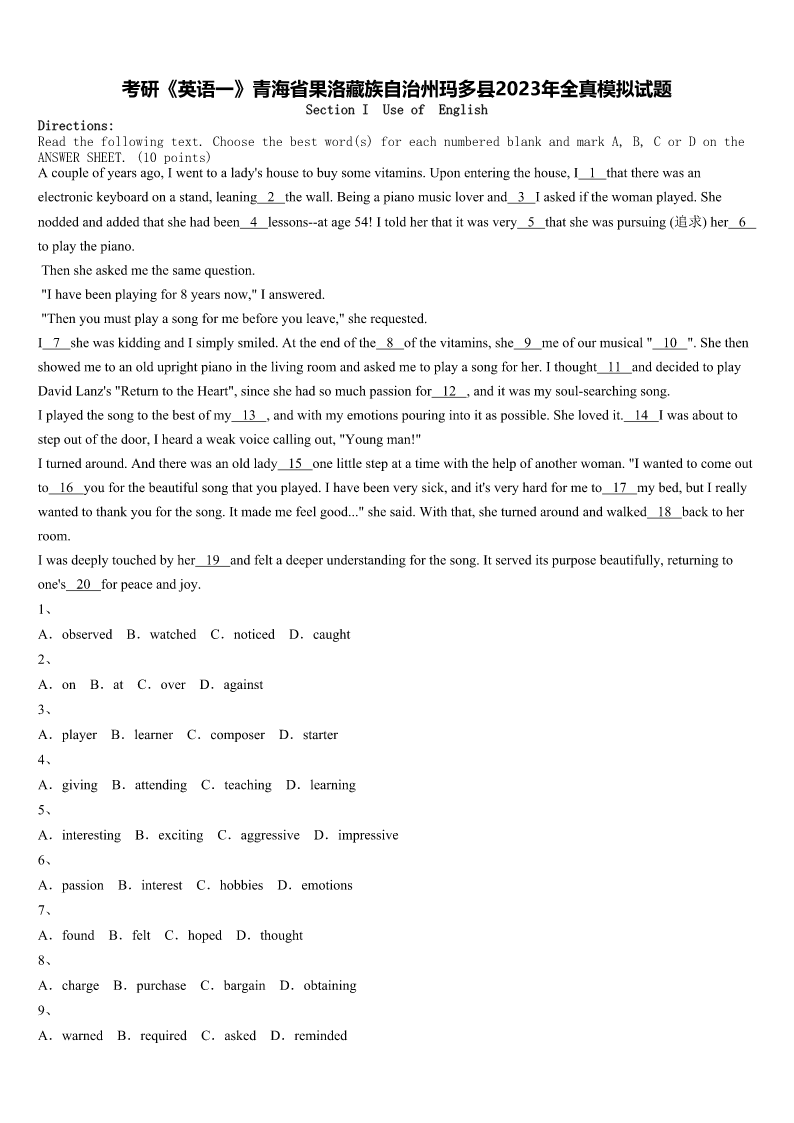 考研《英语一》青海省果洛藏族自治州玛多县2023年全真模拟试题SectionIUseofEnglishDirections:Readthefollowingtext.Choosethebestword(s)foreachnumberedblankandmarkA,B,CorDontheANSWERSHEET.(10points)Acoupleofyearsago,Iwenttoalady'shousetobuysomevitamins.Uponenteringthehouse,I1thattherewas