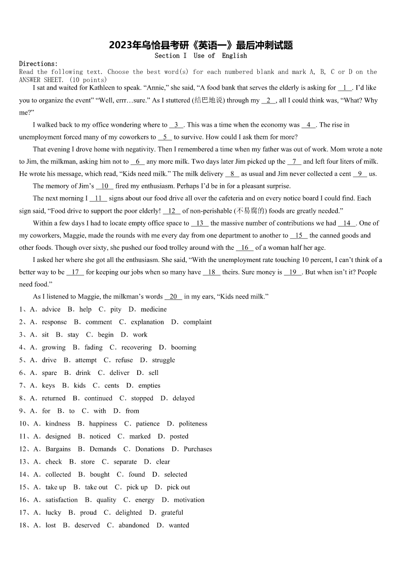 2023年乌恰县考研《英语一》最后冲刺试题SectionIUseofEnglishDirections:Readthefollowingtext.Choosethebestword(s)foreachnumberedblankandmarkA,B,CorDontheANSWERSHEET.(10points)IsatandwaitedforKathleentospeak.“Annie,”shesaid,“Afoodbankthatservestheelderlyisaskingfor1.I’dlikeyo