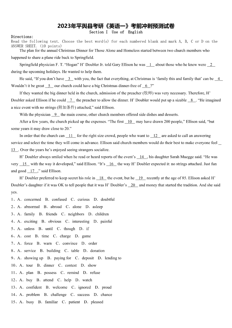 2023年平舆县考研《英语一》考前冲刺预测试卷SectionIUseofEnglishDirections:Readthefollowingtext.Choosethebestword(s)foreachnumberedblankandmarkA,B,CorDontheANSWERSHEET.(10points)TheplanfortheannualChristmasDinnerforThoseAloneandHomelessstartedbetweentwochurchmemberswhohappene