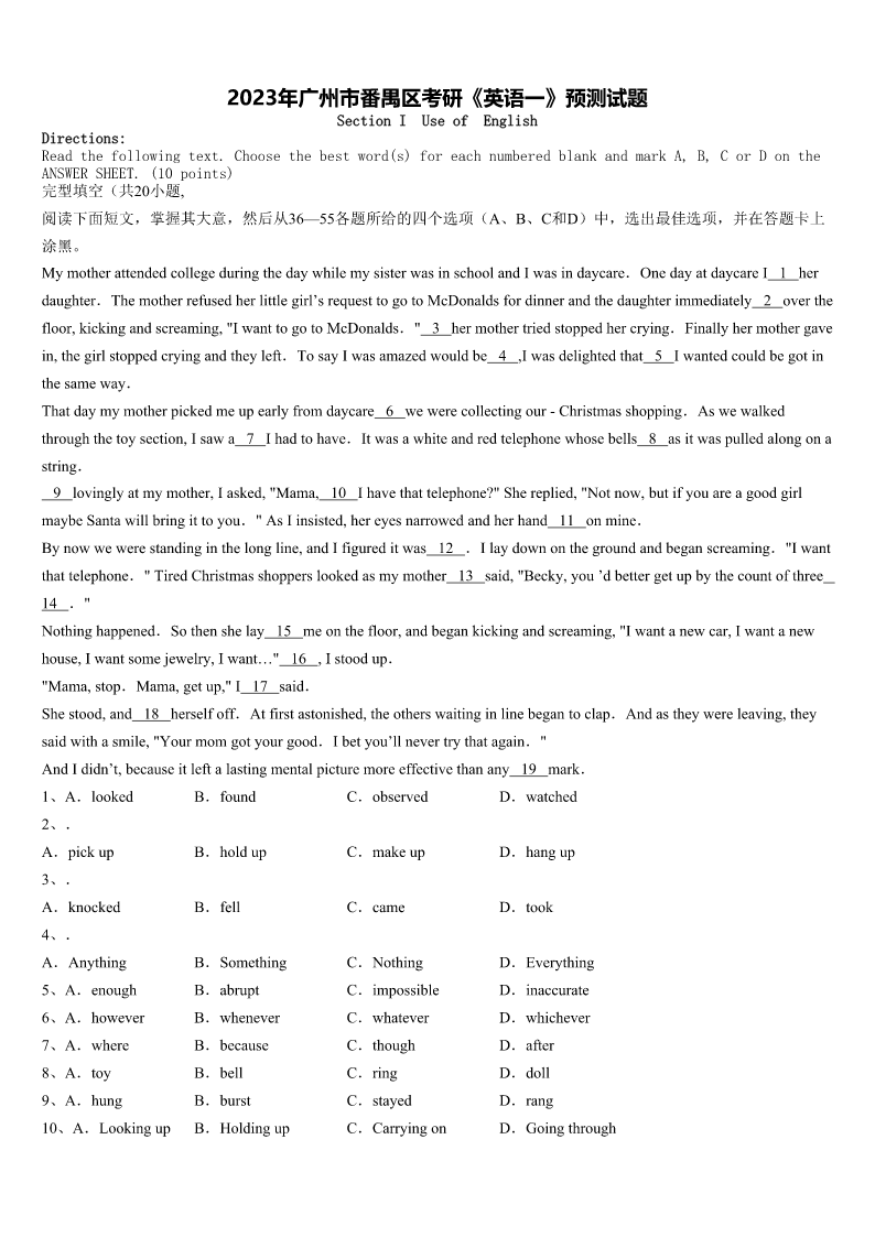 2023年广州市番禺区考研《英语一》预测试题SectionIUseofEnglishDirections:Readthefollowingtext.Choosethebestword(s)foreachnumberedblankandmarkA,B,CorDontheANSWERSHEET.(10points)完型填空(共20小题,阅读下面短文,掌握其大意,然后从36—55各题所给的四个选项(A、B、C和D)中,选出最佳选项,并在答题卡上涂黑。Mymotherattendedcollegeduringth