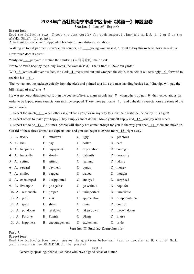 2023年广西壮族南宁市邕宁区考研《英语一》押题密卷SectionIUseofEnglishDirections:Readthefollowingtext.Choosethebestword(s)foreachnumberedblankandmarkA,B,CorDontheANSWERSHEET.(10points)Agreatmanypeoplearedisappointedbecauseofunrealisticexpectations.Walkinguptoadepartmentstore’scl