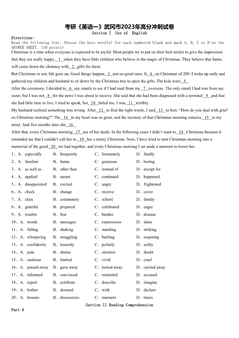 考研《英语一》武冈市2023年高分冲刺试卷SectionIUseofEnglishDirections:Readthefollowingtext.Choosethebestword(s)foreachnumberedblankandmarkA,B,CorDontheANSWERSHEET.(10points)Christmasisatimewheneveryoneisexpectedtobejoyful.Mostpeopletrytoputontheirbestsmilestogivetheimpress