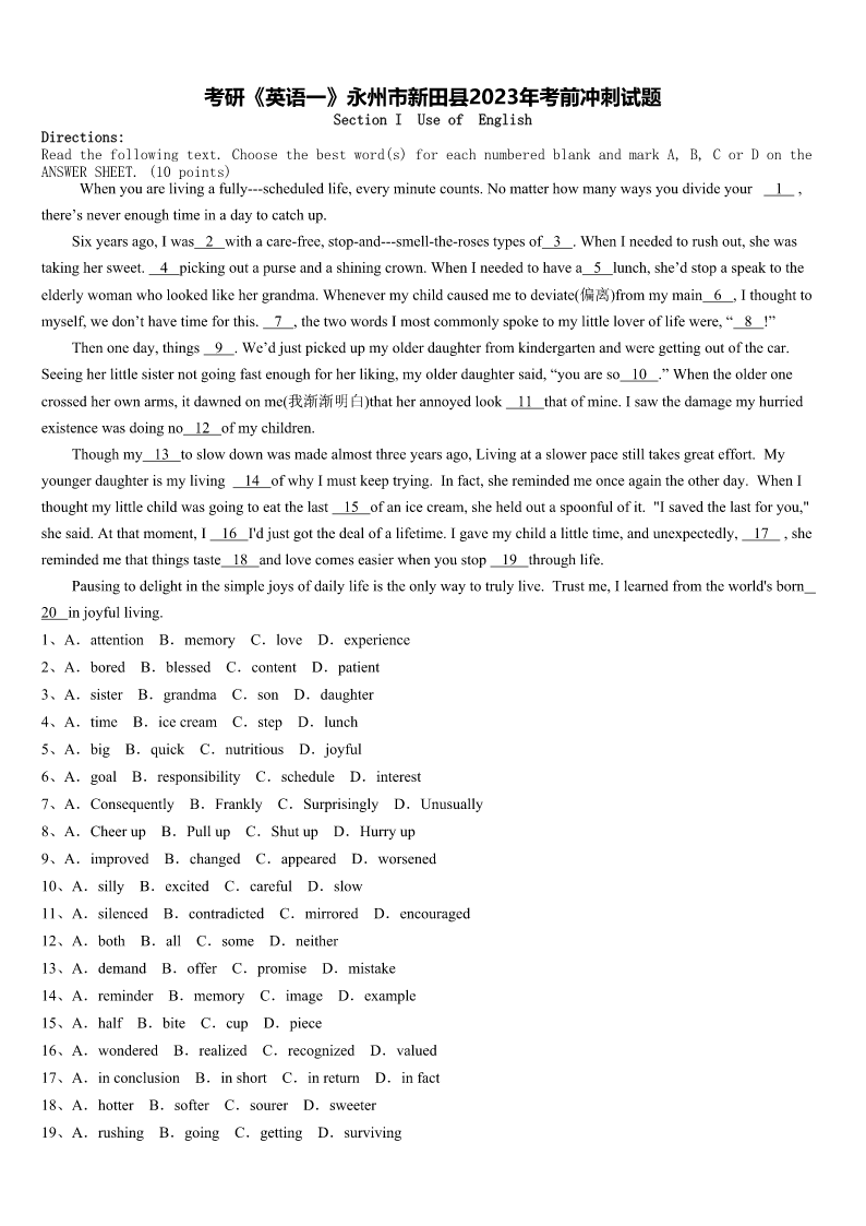 考研《英语一》永州市新田县2023年考前冲刺试题SectionIUseofEnglishDirections:Readthefollowingtext.Choosethebestword(s)foreachnumberedblankandmarkA,B,CorDontheANSWERSHEET.(10points)Whenyouarelivingafully---scheduledlife,everyminutecounts.Nomatterhowmanywaysyoudivideyour1,there’
