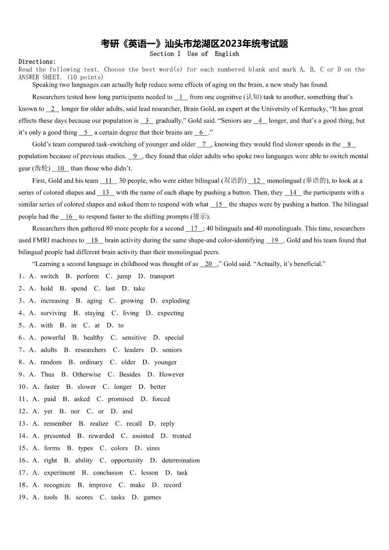 考研《英语一》汕头市龙湖区2023年统考试题SectionIUseofEnglishDirections:Readthefollowingtext.Choosethebestword(s)foreachnumberedblankandmarkA,B,CorDontheANSWERSHEET.(10points)Speakingtwolanguagescanactuallyhelpreducesomeeffectsofagingonthebrain,anewstudyhasfound.Researchers