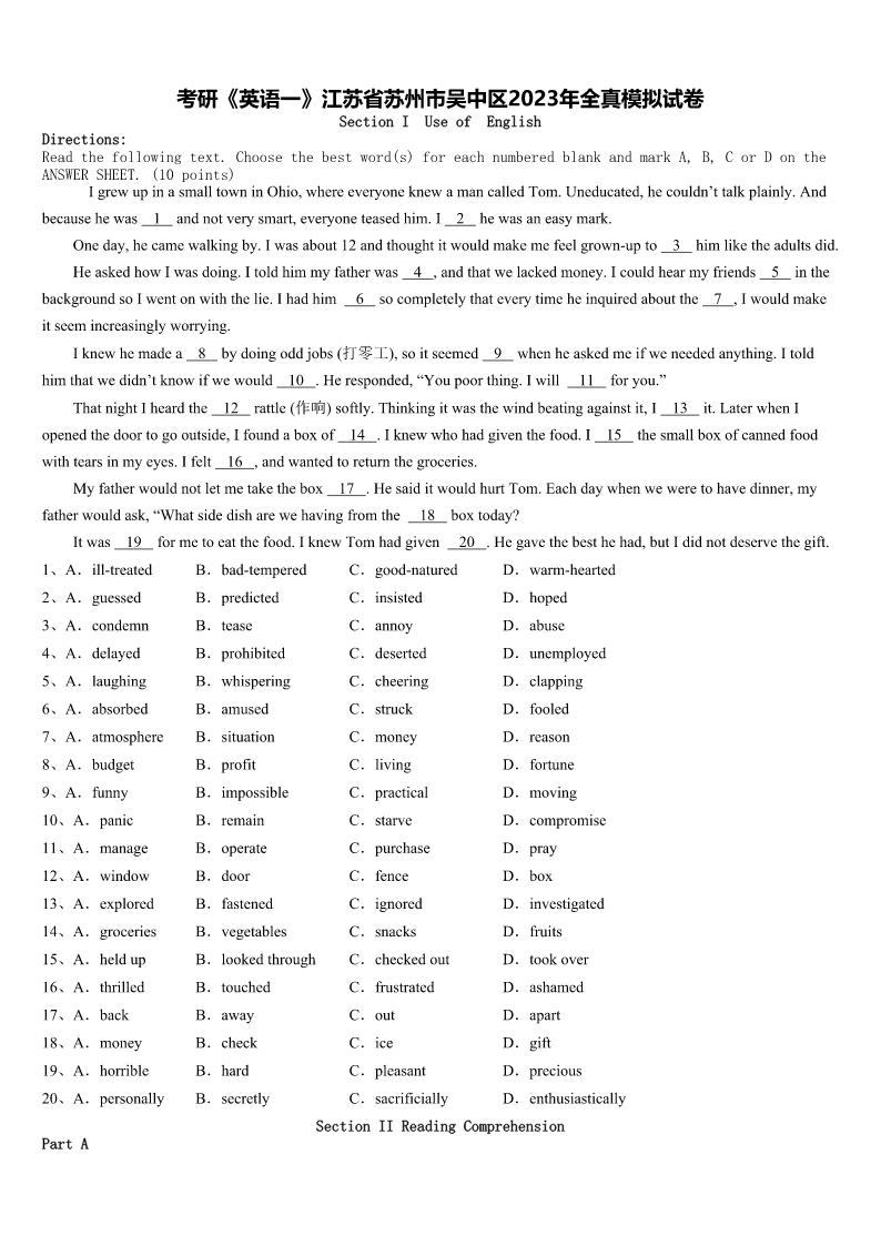 考研《英语一》江苏省苏州市吴中区2023年全真模拟试卷SectionIUseofEnglishDirections:Readthefollowingtext.Choosethebestword(s)foreachnumberedblankandmarkA,B,CorDontheANSWERSHEET.(10points)IgrewupinasmalltowninOhio,whereeveryoneknewamancalledTom.Uneducated,hecouldn’ttalkplainly.Andb