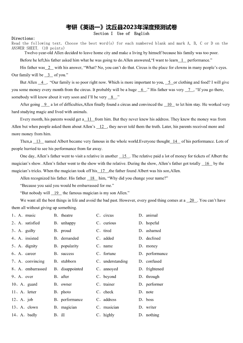 考研《英语一》沈丘县2023年深度预测试卷SectionIUseofEnglishDirections:Readthefollowingtext.Choosethebestword(s)foreachnumberedblankandmarkA,B,CorDontheANSWERSHEET.(10points)Twelve-year-oldAllendecidedtoleavehomecityandmakealivingbyhimselfbecausehisfamilywastoopoor.Beforehe