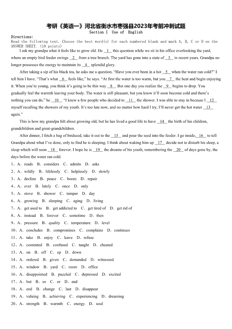 考研《英语一》河北省衡水市枣强县2023年考前冲刺试题SectionIUseofEnglishDirections:Readthefollowingtext.Choosethebestword(s)foreachnumberedblankandmarkA,B,CorDontheANSWERSHEET.(10points)Iaskmygrandpawhatitfeelsliketogrowold.He1thisquestionwhilewesitinhisofficeoverlookingtheyard,w