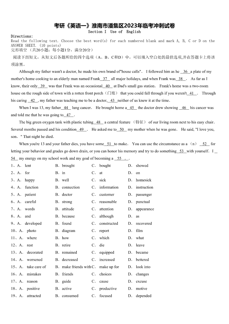 考研《英语一》淮南市潘集区2023年临考冲刺试卷SectionIUseofEnglishDirections:Readthefollowingtext.Choosethebestword(s)foreachnumberedblankandmarkA,B,CorDontheANSWERSHEET.(10points)完形填空(共20小题;每小题1分,满分20分)阅读下面短文,从短文后各题所给的四个选项(A、B、C和D)中,可以填入空白处的最佳选项,并在答题卡上将该项涂黑。Althoughmyfatherwa