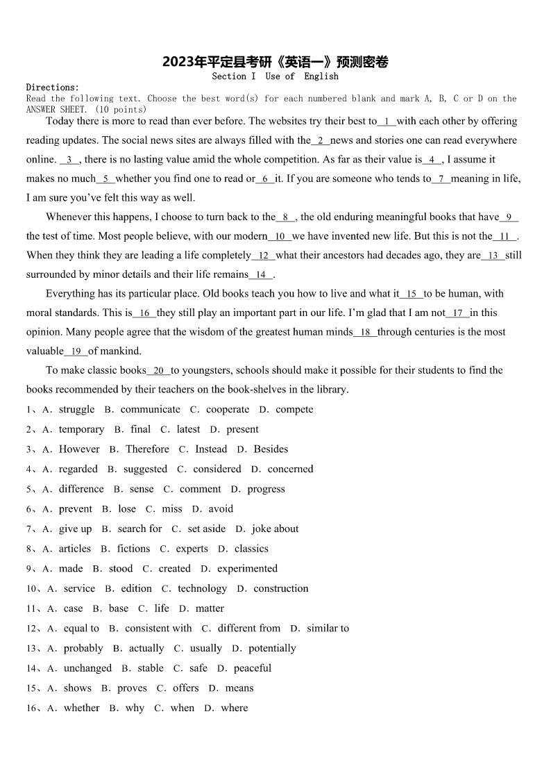 2023年平定县考研《英语一》预测密卷SectionIUseofEnglishDirections:Readthefollowingtext.Choosethebestword(s)foreachnumberedblankandmarkA,B,CorDontheANSWERSHEET.(10points)Todaythereismoretoreadthaneverbefore.Thewebsitestrytheirbestto1witheachotherbyofferingreadingupdates.T