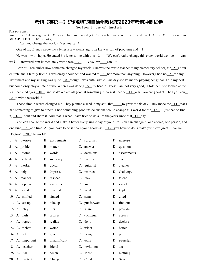 考研《英语一》延边朝鲜族自治州敦化市2023年考前冲刺试卷SectionIUseofEnglishDirections:Readthefollowingtext.Choosethebestword(s)foreachnumberedblankandmarkA,B,CorDontheANSWERSHEET.(10points)Canyouchangetheworld?Yesyoucan!Oneofmyfriendswrotemealetterafewweeksago.Hislifewasfullofprob
