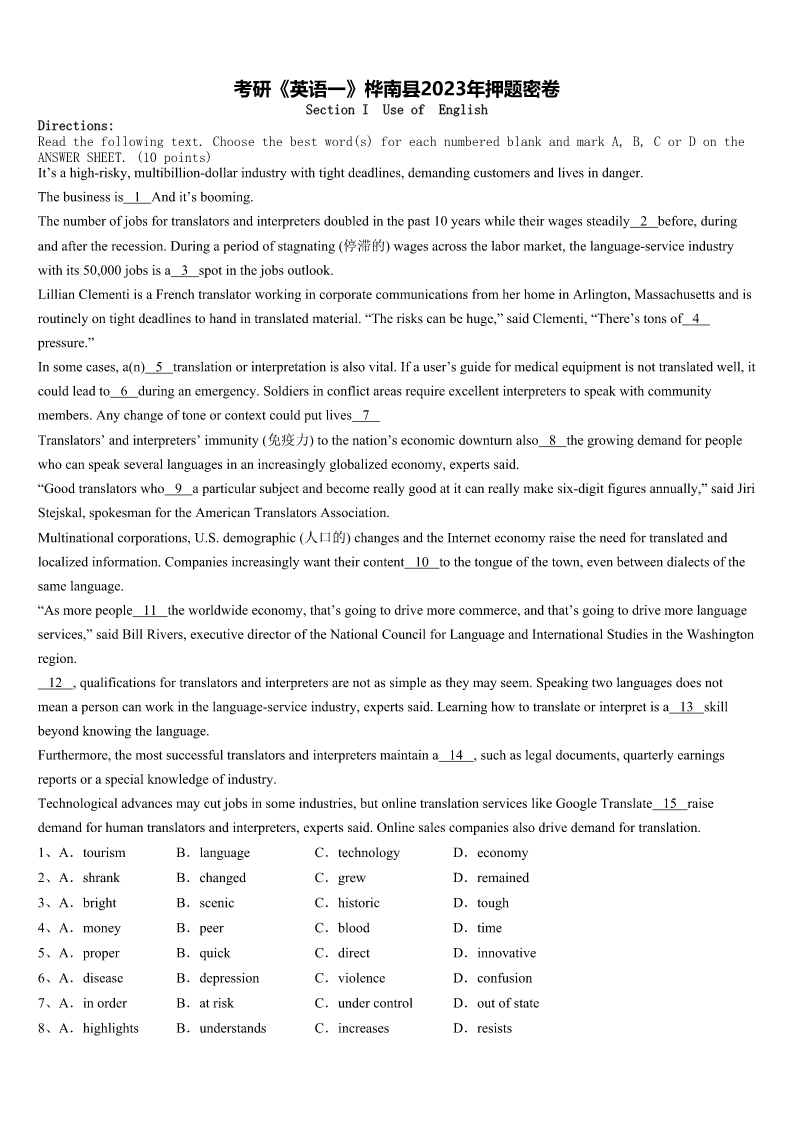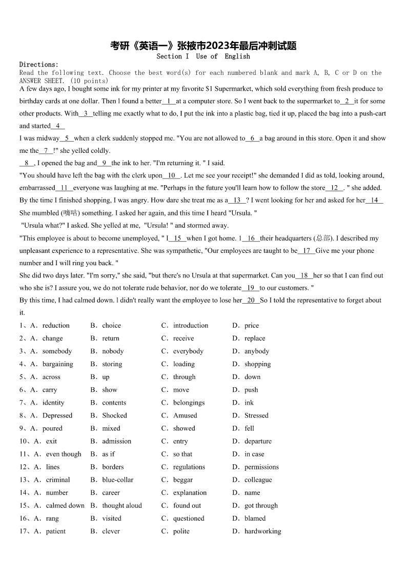 考研《英语一》张掖市2023年最后冲刺试题SectionIUseofEnglishDirections:Readthefollowingtext.Choosethebestword(s)foreachnumberedblankandmarkA,B,CorDontheANSWERSHEET.(10points)Afewdaysago,Iboughtsomeinkformyprinteratmyfavorite$1Supermarket,whichsoldeverythingfromfreshproducet