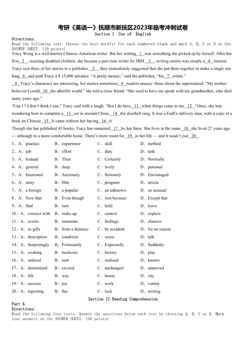 考研《英语一》抚顺市新抚区2023年临考冲刺试卷SectionIUseofEnglishDirections:Readthefollowingtext.Choosethebestword(s)foreachnumberedblankandmarkA,B,CorDontheANSWERSHEET.(10points)TracyWongisawell-knownChinese-Americanwriter.Butherwriting1wassomethingshepickedupbyherself.After