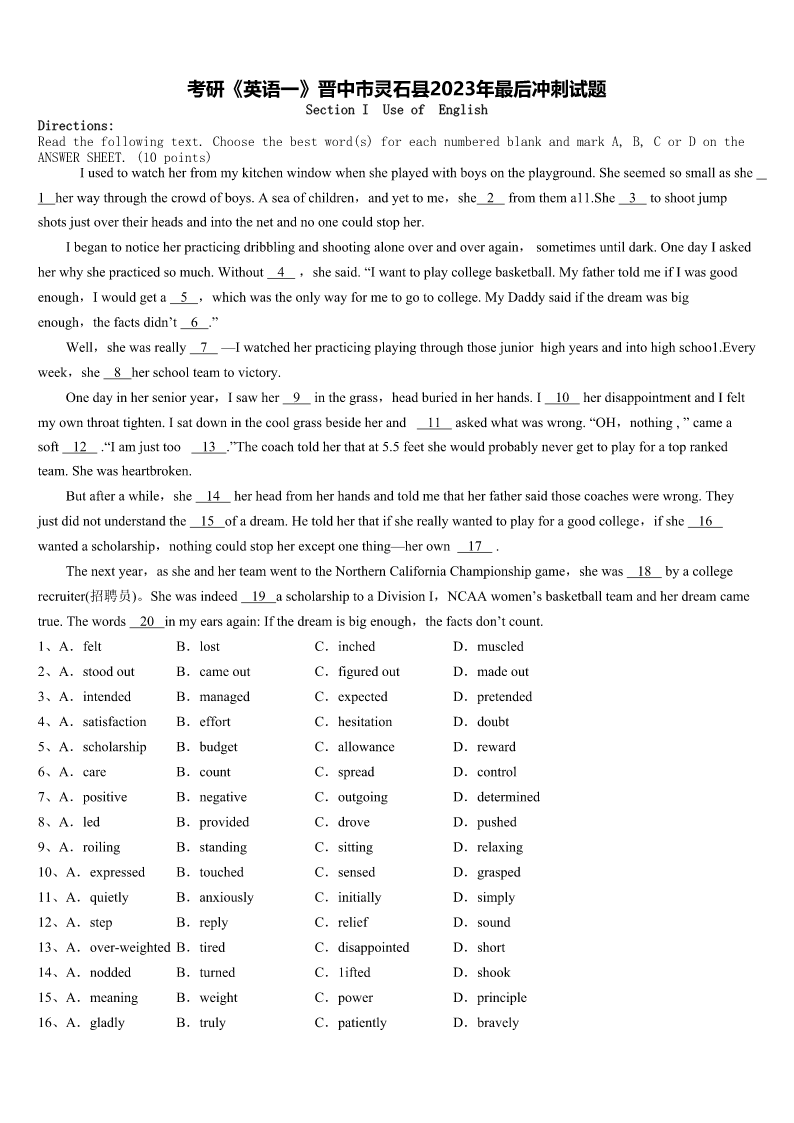 考研《英语一》晋中市灵石县2023年最后冲刺试题SectionIUseofEnglishDirections:Readthefollowingtext.Choosethebestword(s)foreachnumberedblankandmarkA,B,CorDontheANSWERSHEET.(10points)Iusedtowatchherfrommykitchenwindowwhensheplayedwithboysontheplayground.Sheseemedsosmallasshe1herw
