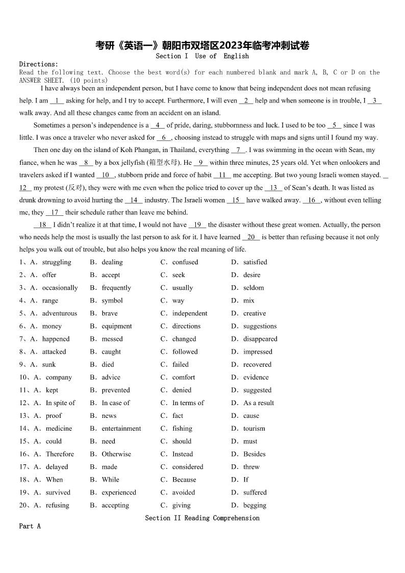 考研《英语一》朝阳市双塔区2023年临考冲刺试卷SectionIUseofEnglishDirections:Readthefollowingtext.Choosethebestword(s)foreachnumberedblankandmarkA,B,CorDontheANSWERSHEET.(10points)Ihavealwaysbeenanindependentperson,butIhavecometoknowthatbeingindependentdoesnotmeanrefusinghelp.