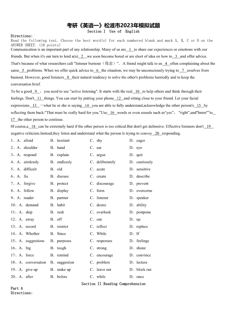 考研《英语一》松滋市2023年模拟试题SectionIUseofEnglishDirections:Readthefollowingtext.Choosethebestword(s)foreachnumberedblankandmarkA,B,CorDontheANSWERSHEET.(10points)Communicationisanimportantpartofanyrelationship.Manyofusare1toshareourexperiencesoremotionswithourfrie