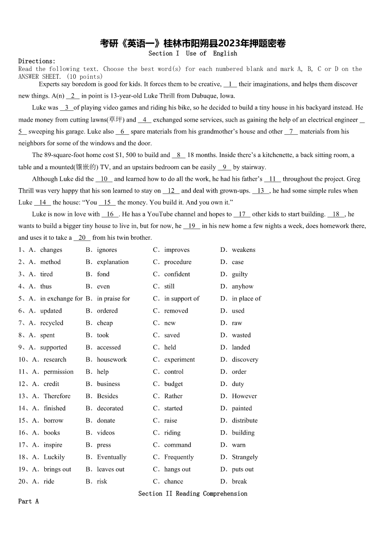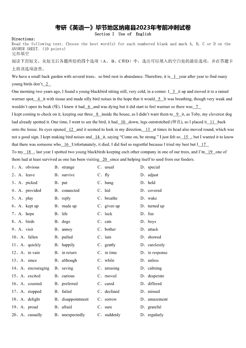 考研《英语一》毕节地区纳雍县2023年考前冲刺试卷SectionIUseofEnglishDirections:Readthefollowingtext.Choosethebestword(s)foreachnumberedblankandmarkA,B,CorDontheANSWERSHEET.(10points)完形填空阅读下面短文,从短文后各题所给的四个选项(A、B、C和D)中,选出可以填入的空白处的最佳选项,并在答题卡上将该选项涂黑。Wehaveasmallbackgardenwithsevera