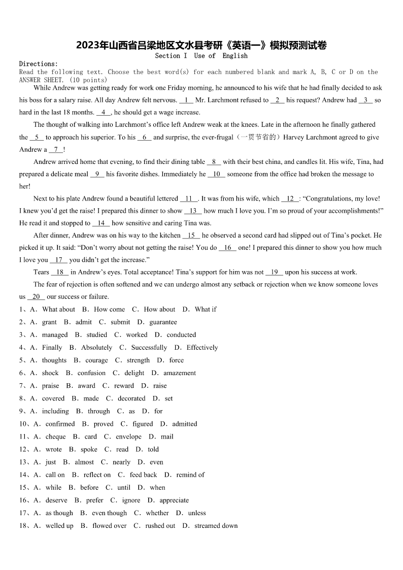 2023年山西省吕梁地区文水县考研《英语一》模拟预测试卷SectionIUseofEnglishDirections:Readthefollowingtext.Choosethebestword(s)foreachnumberedblankandmarkA,B,CorDontheANSWERSHEET.(10points)WhileAndrewwasgettingreadyforworkoneFridaymorning,heannouncedtohiswifethathehadfinallydecided