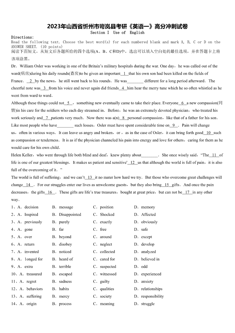 2023年山西省忻州市岢岚县考研《英语一》高分冲刺试卷SectionIUseofEnglishDirections:Readthefollowingtext.Choosethebestword(s)foreachnumberedblankandmarkA,B,CorDontheANSWERSHEET.(10points)阅读下面短文,从短文后各题所给的四个选项(A、B、C和D)中,选出可以填入空白处的最佳选项,并在答题卡上将该项涂黑。Dr.WilliamOslerwasworkinginoneoftheB