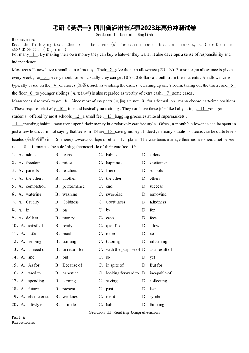 考研《英语一》四川省泸州市泸县2023年高分冲刺试卷SectionIUseofEnglishDirections:Readthefollowingtext.Choosethebestword(s)foreachnumberedblankandmarkA,B,CorDontheANSWERSHEET.(10points)Formany1.Bymakingtheirownmoneytheycanbuywhatevertheywant.Italsodevelopsasenseofresponsibilityan